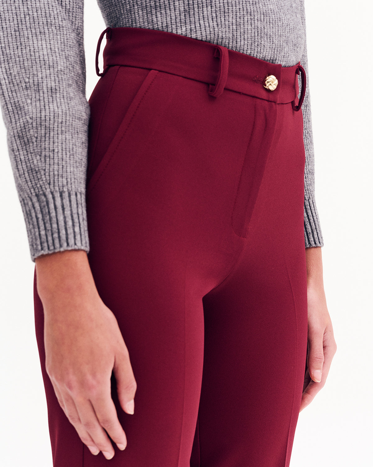 Παντελόνι κρεπ σε ίσια γραμμή. Θηλιές για ζώνη και τσέπες φιλέτο στο πίσω μέρος με χρυσά κουμπιά.