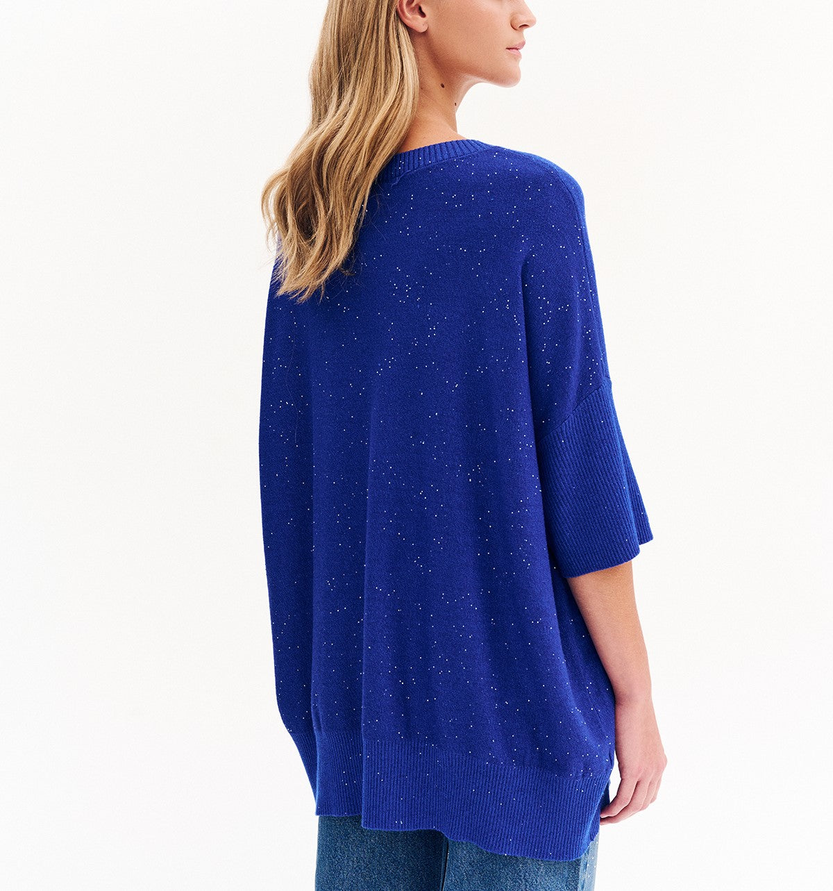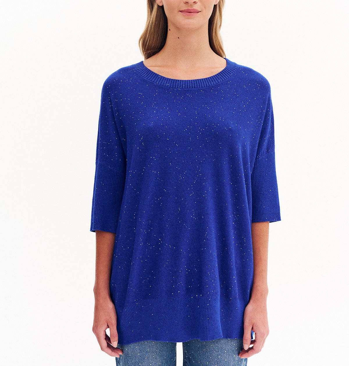 Πλεκτή μπλούζα με λεπτή παγιέτα στην ύφανση. Άνετη γραμμή με στρογγυλή λαιμόκοψη και μανίκι 3/4.