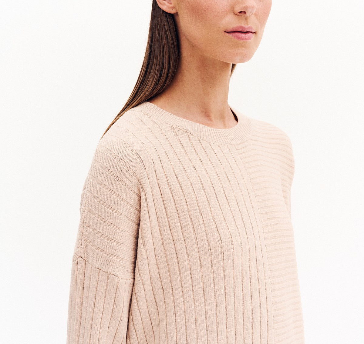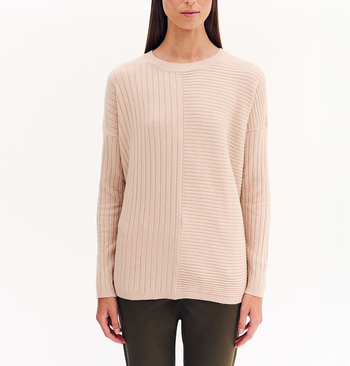 Πλεκτή μπλούζα με στρογγυλή λαιμόκοψη, κάθετες και οριζόντιες γραμμές στην ύφανση. Μακρύ μανίκι.